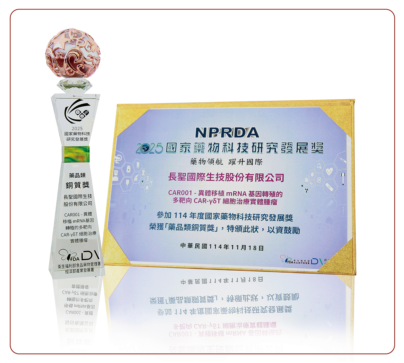 衛生福利部與經濟部於11月18日在國家生技研究園區共同舉辦「2025國家藥物科技研究發展獎」頒獎典禮,長聖生技的「CAR001-異體移植mRNA基因轉殖的多靶向CAR-γδ T細胞治療實體腫瘤」榮獲藥品類-銅質獎,針對異體、非病毒mRNA編輯的多靶點免疫細胞療法,專為難治型實體腫瘤設計,如大腸直腸癌、三陰性乳癌、膠質母細胞瘤及非小細胞肺癌等,在研發領域中的卓越成就受到評審們的肯定,期望透過各單位的持續支持與推動,攜手共創生技醫藥品牌的新價值,朝向為國人帶來更健康的目標穩健邁進。