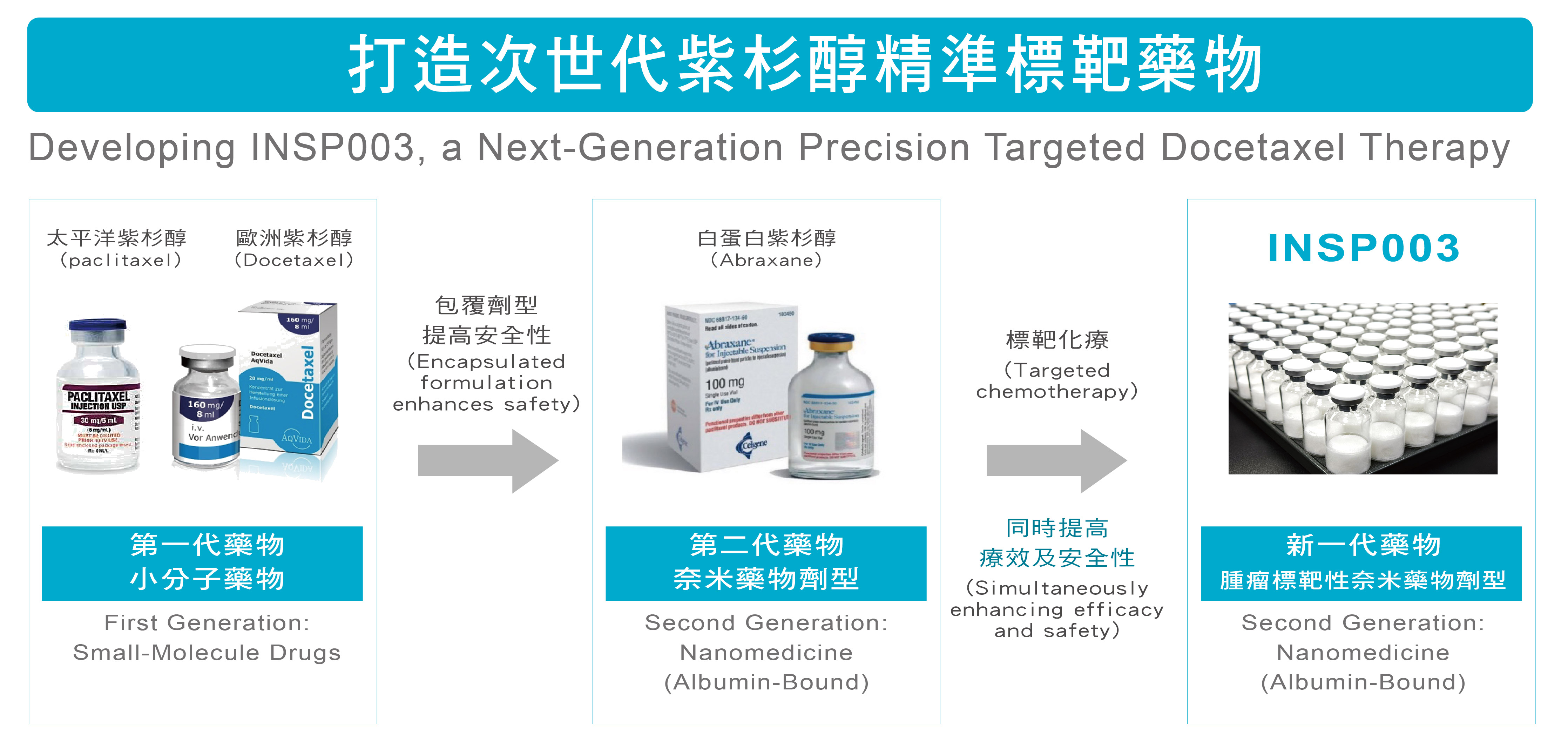 INSP003 以奈米載體技術為核心,在既有紫杉醇療效基礎上,同步強化腫瘤標靶性與安全性,具備成為第三代紫杉醇藥物的潛力。
